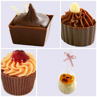 Copinho de chocolate ao leite com brigadeiro, Chocolate ao leite com ganache e amendoas, chocolate ao leite com ganache branca e geleia de frutas vermelhas e copinho de mousse de maracuja.